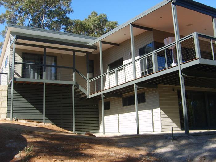 A holiday home built for 2 families with a mirror effect, Designed by Mike, this home has both sides with equal number of rooms with a central living area and down stairs retreat for the children. From every angle, this home is at one with the environment, with the design and choice of materials aimed at solar passive aspect. The home has water saving plumbing fixtures, envirotanks for recycled water and a photovoltaic hot water system. Recycled timber for the main living area floorboards gives the home a unique character of its own.